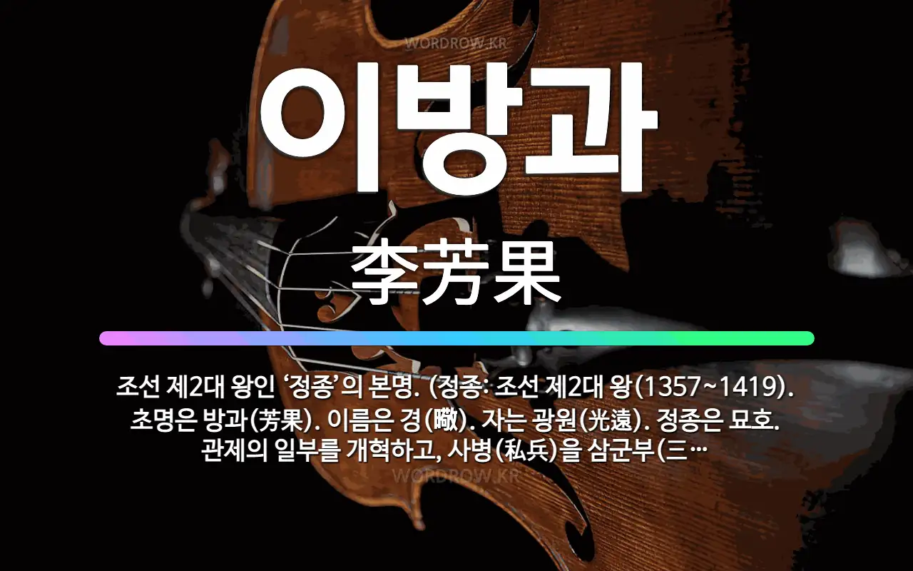 태조 이성계는 그 아래 일곱째 아들을 두었습니다. 향처(시골부인)인 한씨의 소생으로 5남이, 경처(서울 부인) 강씨의 소생으로 2남이 있습니다. 그 일곱 형제 중에서 이성계의 기질을 가장 닮은 것은 이방과라고 합니다. 젊었을 때부터 이성계를 도와 전쟁터를 누볐고, 뛰어난 무공 솜씨를 지녔고 체격도 컸고 착하기도 했다고 합니다. 실제로 칼과 피로 권력을 쟁취한 이방원이 문인 출신인 것과는 대조적인 이미지입니다.