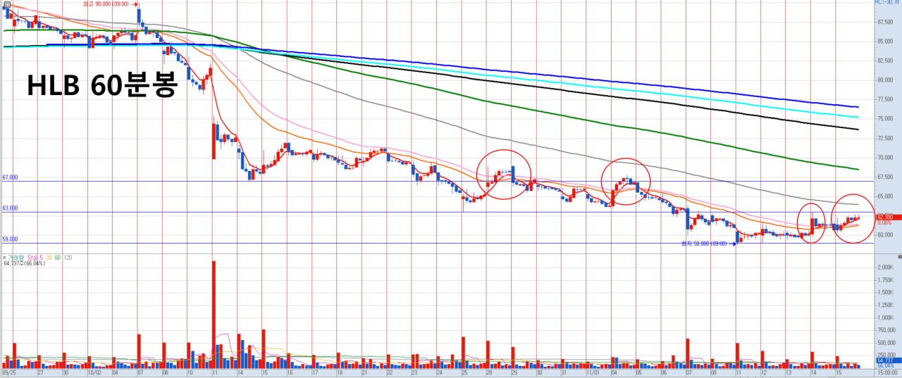 다시 간단하게 HLB뷰를 말씀드려보겠습니다. 지난 목요일 60분봉 관점으로 이번 하락에서는 세번째로 캔들이 핑크, 주황선을 뚫고 올라왔고, 이 자리를 지켜주는지 봐야 된다고 하였습니다. 이후 캔들이 횡보하면서 핑크, 주황선을 지지하며 확실하게 올라왔고, 그 사이 빨간 5선 역시 처음으로 핑크, 주황선을 뚫고 올라오며 역배열에서 정배열로 바꾸려는 모습을 보이고 있습니다. 한편, 일봉상으로는 캔들이 처음으로 5일선을 확실하게 타는 모습이 나왔습니다. 결론적으로 비모 실사 관련 뉴스나 일정에 맞춰서 HLB 차트는 바닥을 다지면서 추세를 바꾸려는 움직임을 보여주려 하고 있기에 다음주는 우려보다는 기대감을 가져도 좋을 것 같습니다.